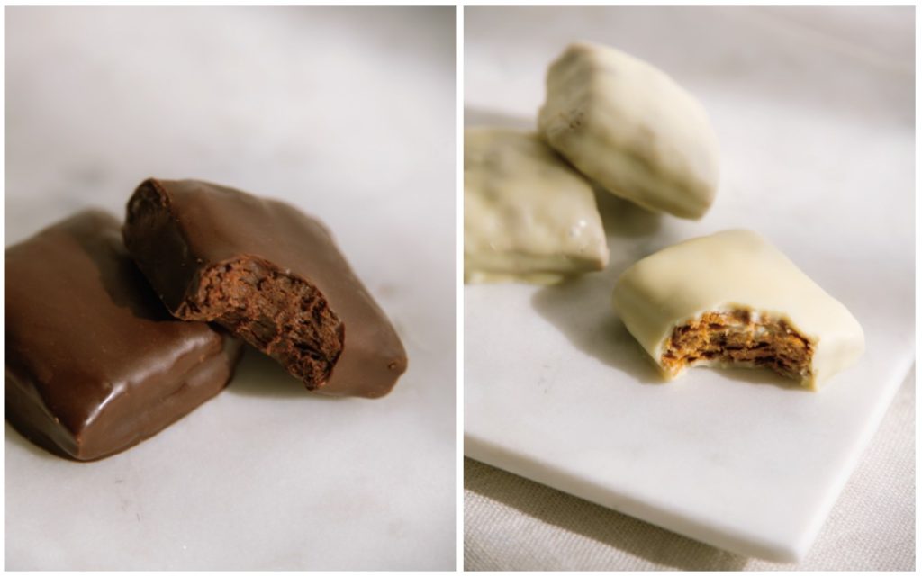 カカオ生地にチョコレートをたっぷり染み込ませたブラックと、アールグレイを練り